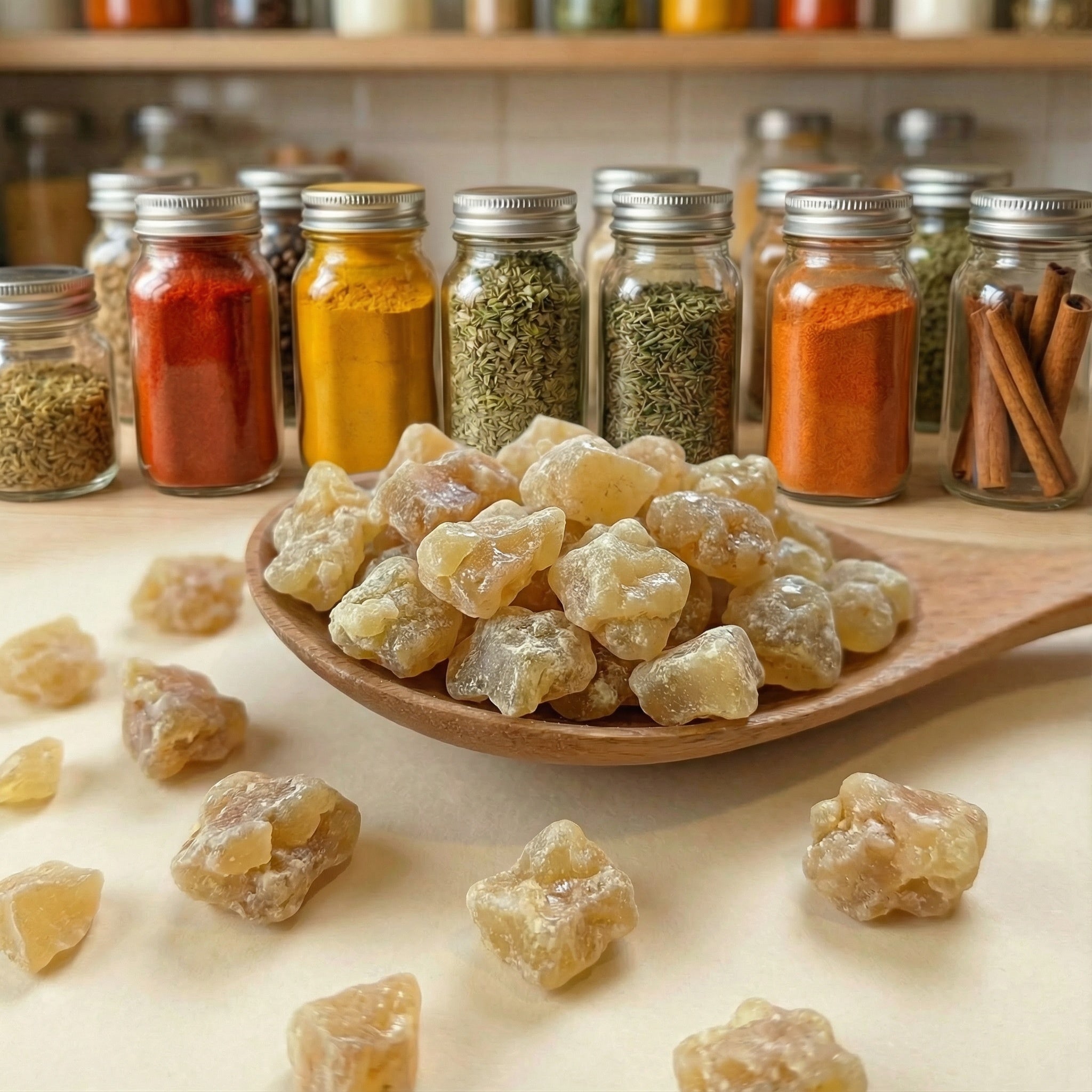 L'asafoetida (ou ase fétide), connue en Inde sous le nom de hing, est une gomme-résine séchée extraite des racines de plusieurs plantes du genre Ferula. Présentée sous forme de bloc, c'est sa forme la plus pure et la plus puissante. Crue, l'asafoetida a une odeur extrêmement forte et piquante, souvent décrite comme alliacée et sulfureuse, ce qui lui a valu le surnom de "crotte du diable". Cependant, cette odeur âcre se dissipe complètement à la cuisson et se transforme en une saveur douce et savoureuse, très similaire à celle de l'ail et de l'oignon cuits. C'est un ingrédient essentiel dans la cuisine indienne, en particulier dans les plats végétariens et pour les personnes qui n'utilisent ni ail ni oignon. Une toute petite quantité de résine est généralement râpée ou écrasée et frite dans l'huile chaude au début de la cuisson pour parfumer les plats de légumineuses, les soupes et les currys. Elle est également appréciée pour ses propriétés carminatives, aidant à la digestion des lentilles et des haricots.