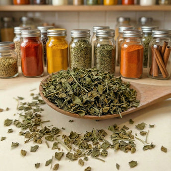 Les feuilles de fenugrec, connues sous le nom de methi (fraîches) ou kasuri methi (séchées), proviennent de la même plante que les graines. Les feuilles séchées ont une saveur herbacée, terreuse et légèrement amère, distincte de celle des graines mais tout aussi caractéristique. Elles sont largement utilisées dans la cuisine de l'Inde du Nord comme herbe aromatique de finition. Émiettées et saupoudrées sur des plats de légumes, des currys crémeux (comme le poulet au beurre) ou des pains plats (comme les naans) juste avant de servir, elles ajoutent une profondeur de saveur et un arôme incomparables. Leur goût est moins prononcé que celui des graines et apporte une touche savoureuse et parfumée.