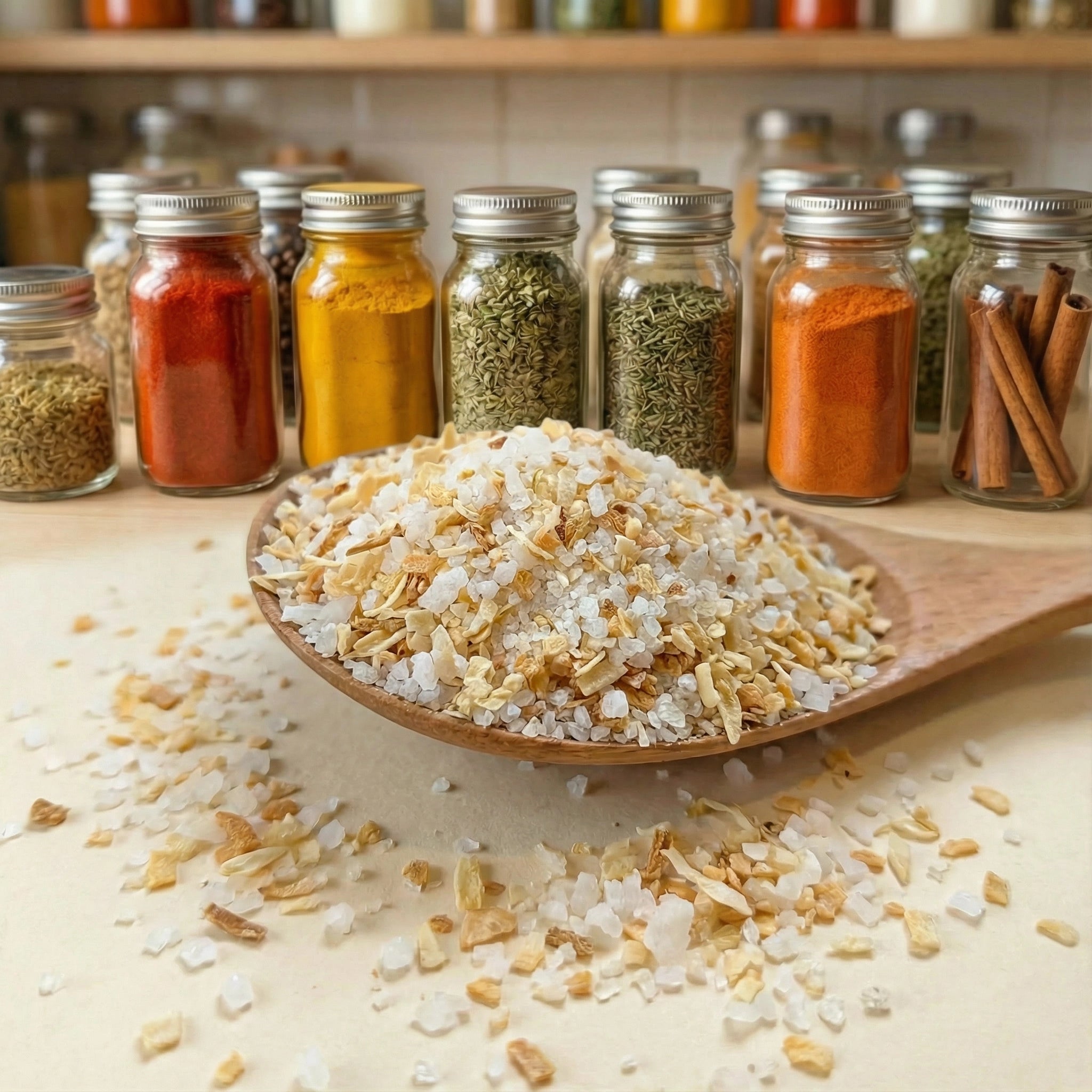 Similaire au sel à l'ail, le sel à l'oignon est un mélange de sel et de poudre d'oignon séché. Il capture la saveur douce et légèrement sucrée de l'oignon, la rendant facilement accessible pour un assaisonnement rapide. C'est un excellent ajout aux soupes, sauces, hamburgers, boulettes de viande et plats de légumes. Il permet d'ajouter une profondeur de saveur sans la texture de l'oignon frais, ce qui est idéal pour les sauces lisses ou pour ceux qui n'apprécient pas les morceaux d'oignon. C'est un basique de l'armoire à épices qui rehausse discrètement la saveur de nombreux plats du quotidien.