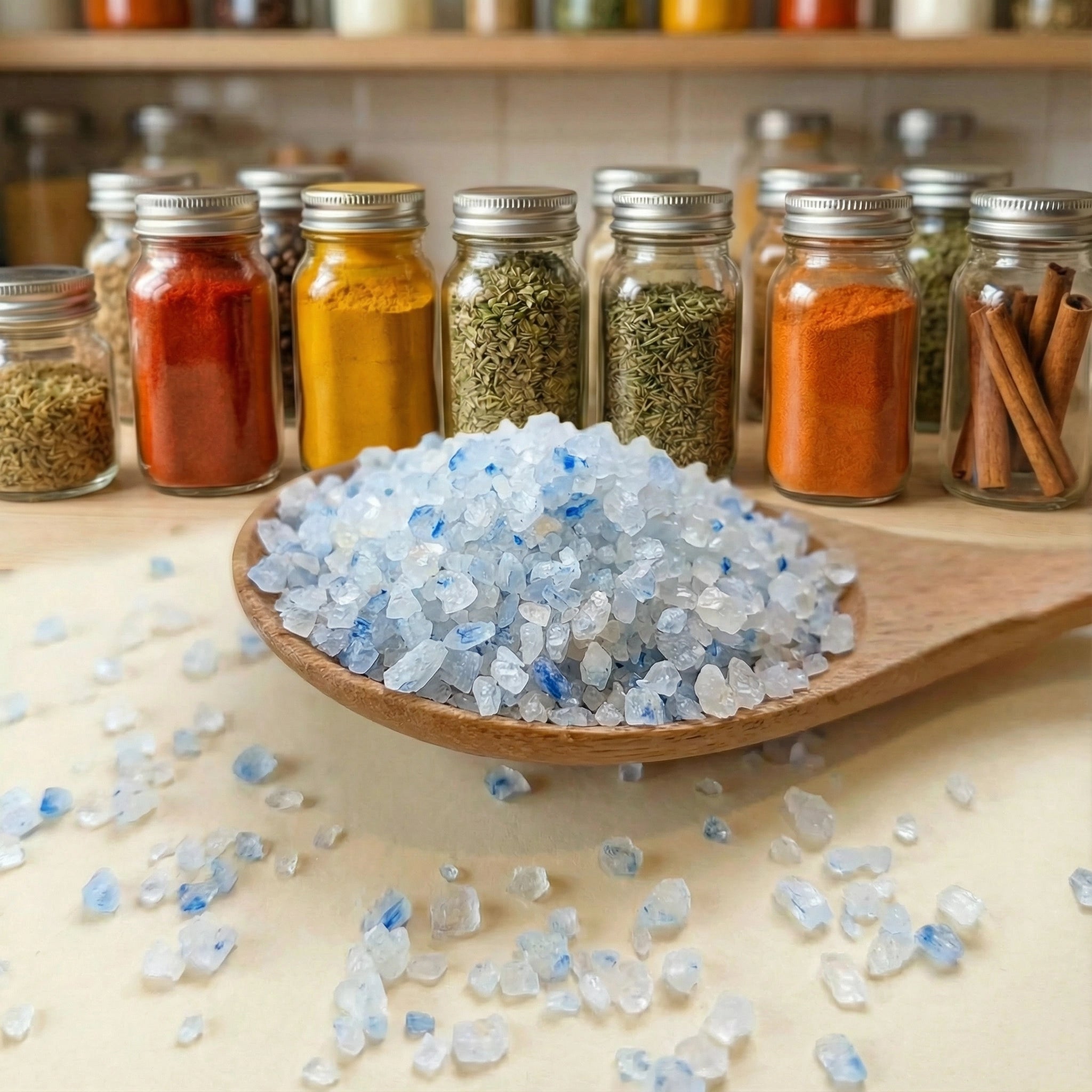 Le sel bleu de Perse est l'un des sels les plus rares et les plus anciens au monde, extrait des mines de la province de Semnan en Iran. Sa couleur bleue unique n'est pas due à sa composition minérale, mais à un phénomène optique de réfraction de la lumière causé par la compression extrême de la structure cristalline du sel. Au goût, il offre une salinité initiale forte qui s'estompe rapidement pour laisser place à une saveur subtilement épicée et presque sucrée. C'est un sel de finition luxueux, idéal pour surprendre les convives. Il se marie particulièrement bien avec le foie gras, les carpaccios, les fruits de mer et les truffitruffes.
