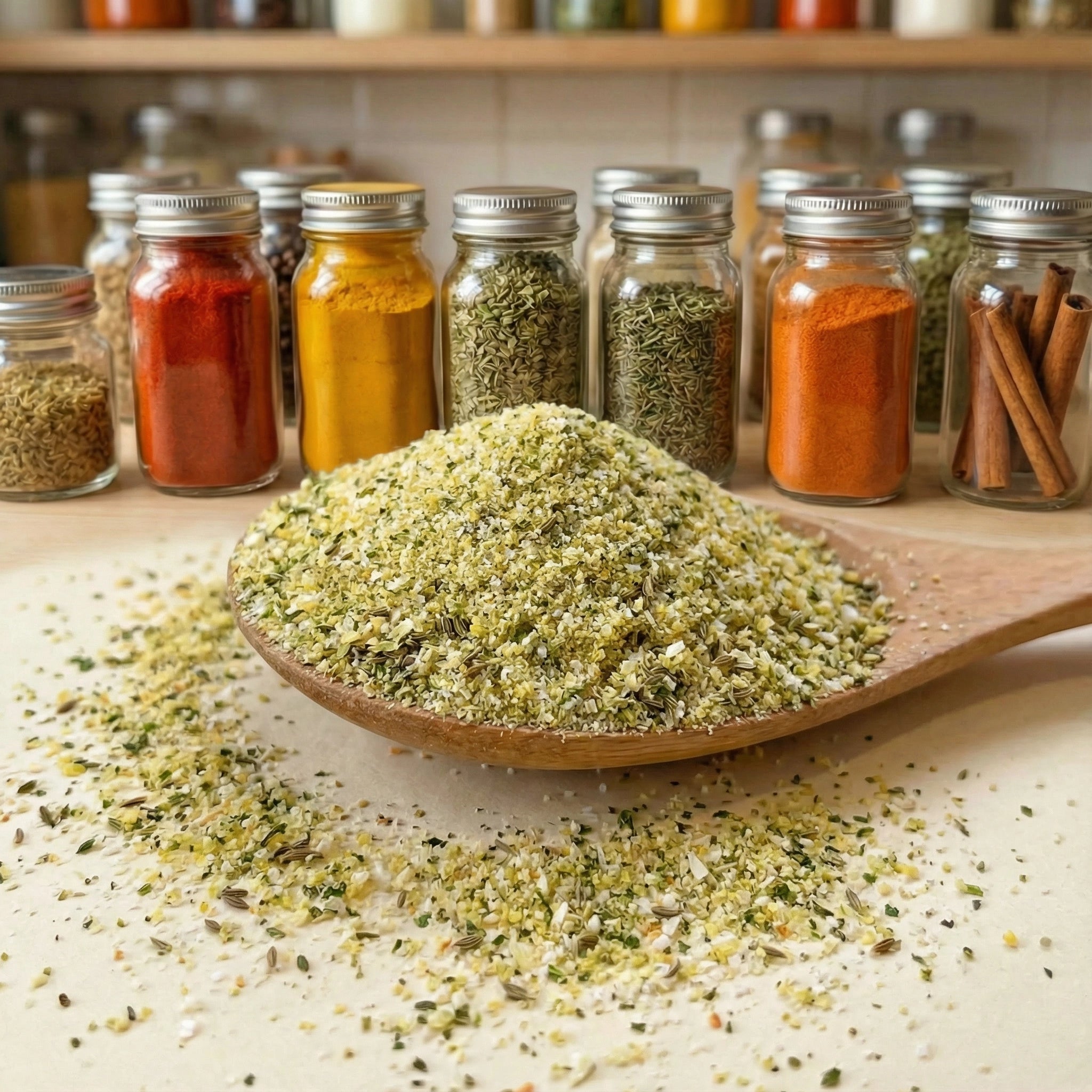 Le sel de céleri est un sel aromatisé classique, indispensable dans de nombreuses cuisines. Il est fabriqué en mélangeant du sel fin avec des graines de céleri finement moulues, et parfois avec de la poudre de livèche pour un arôme plus intense. Son goût est distinctement savoureux, avec des notes végétales et légèrement amères caractéristiques du céleri. C'est l'ingrédient clé du célèbre cocktail Bloody Mary et un assaisonnement traditionnel pour les hot-dogs de style Chicago. Il se marie également à merveille avec les salades de pommes de terre, les soupes, les ragoûts et les jus de légumes.